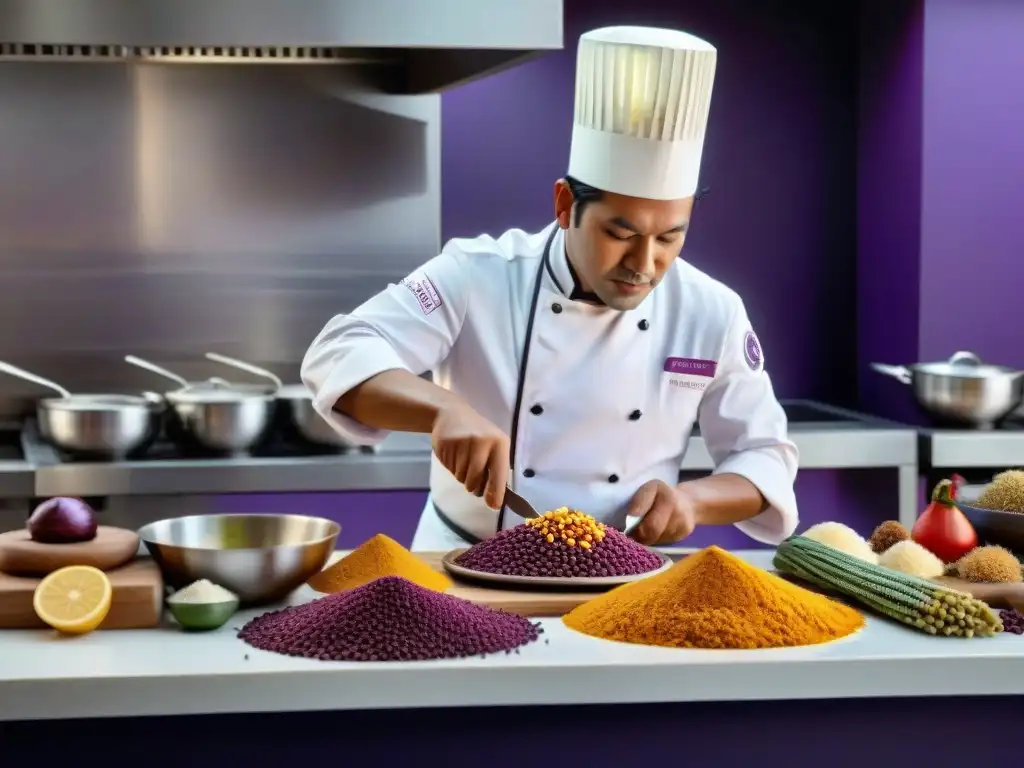 Un chef pastelero experto moldea con precisión un postre espectacular con harina de maíz morado en una cocina vanguardia peruana